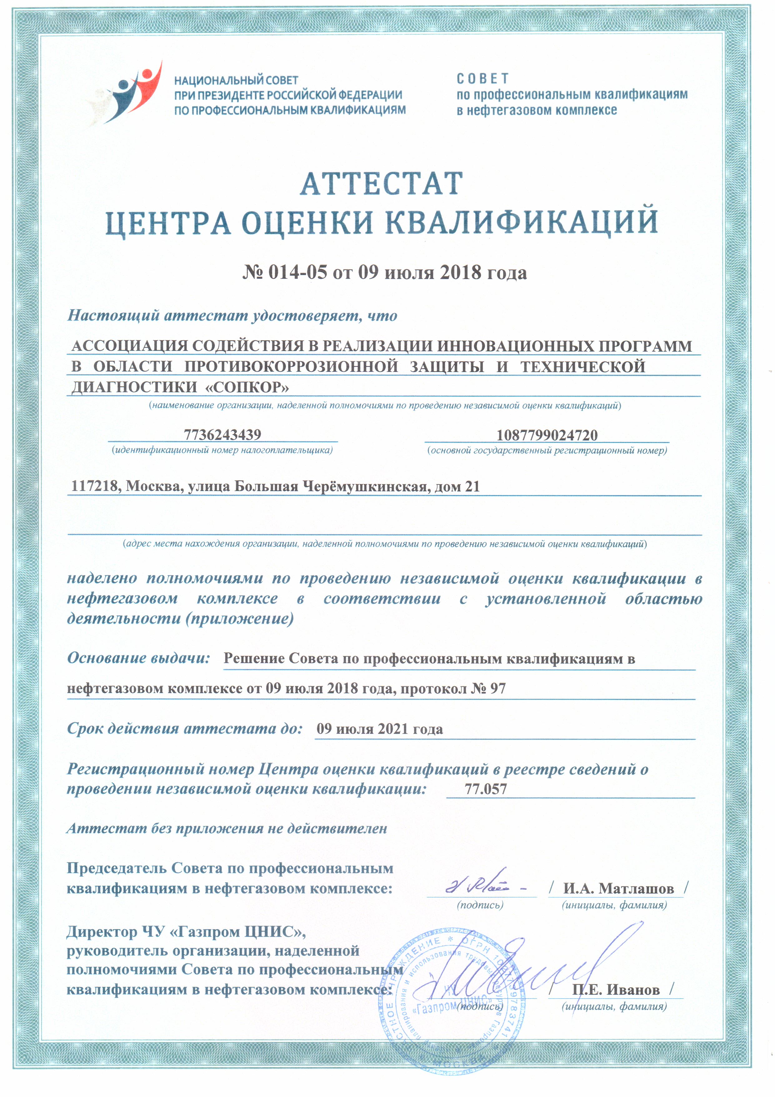Комиссией экспертов Совета по профессиональным квалификациям нефтегазового комплекса (СПК НГК), в составе представителей ПАО «Газпром», ПАО «Транснефть», ОАО «Лукойл» и ПАО «Роснефть» проведена проверка компетентности Ассоциации «СОПКОР» по направлению независимой оценка квалификации персонала. На основании решения комиссии, Совет СПК НГК наделил Ассоциацию «СОПКОР» полномочиями Центра оценки квалификаций в нефтегазовом комплексе (Аттестат ЦОК №014-05 от 9 июля 2018 г.).